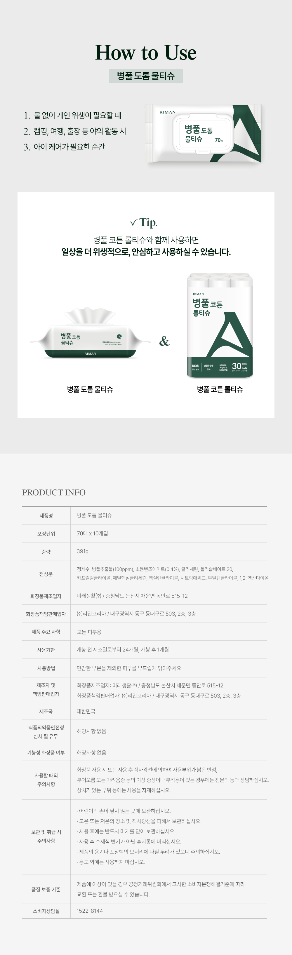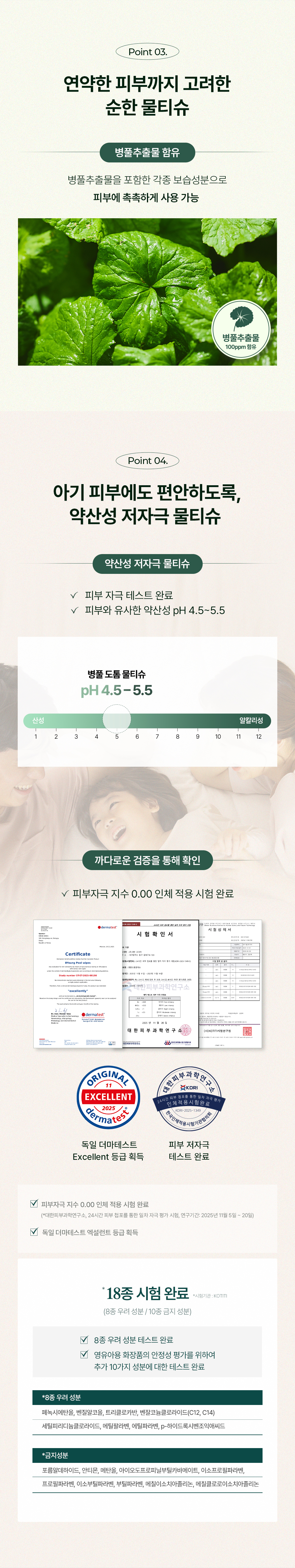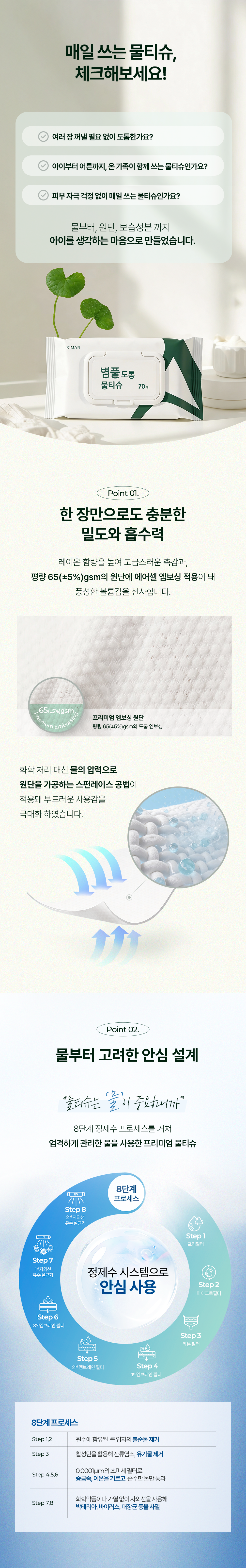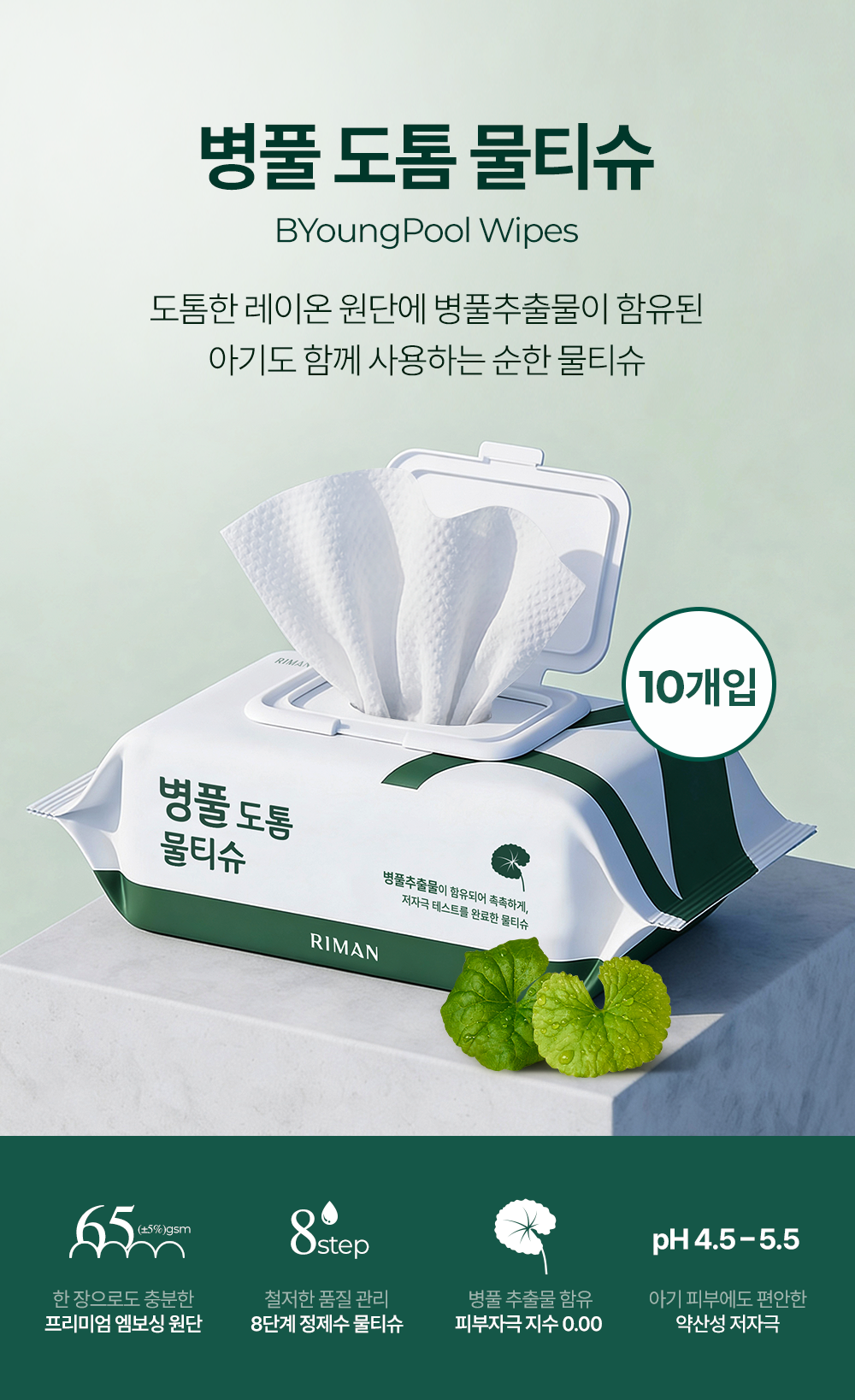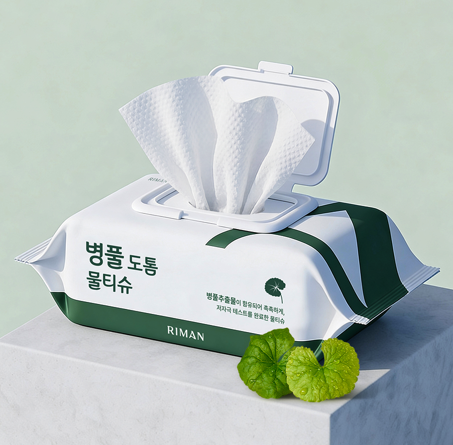 병풀추출물이 함유되어 촉촉하게, 저자극 테스트를 완료한 물티슈